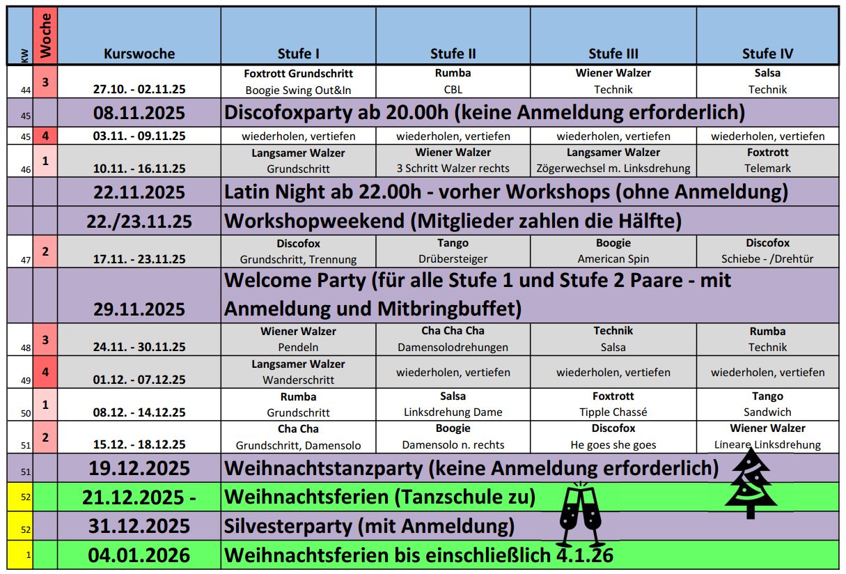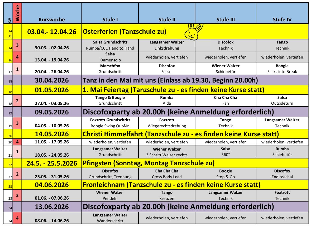 Ein Kursstufenwechsel empfiehlt sich immer am Blockanfang (1 Kursblock = 4 Wochen). Bitte sprecht diesen Wechsel aber mit uns ab. Das Kursprogramm ist so gestaltet, dass die einzelnen Themenschwerpunkte aufeinander aufbauen und in Folgewochen wiederholt werden.